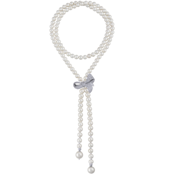 Изготовлено из ювелирного сплава на основе латуни с гальваническим покрытием родием. Изделие украшают жемчуг Майорка диаметром 8-12мм и белый фианит Длина колье 74см.