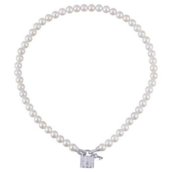 Изготовлено из ювелирного сплава на основе латуни с гальваническим покрытием родием. Изделие украшают белый жемчуг Майорка диаметром 8мм и белый фианит Длина колье 45см.