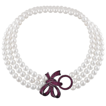 Изготовлено из ювелирного сплава на основе латуни с гальваническим покрытием черным родием. Изделие украшают белый жемчуг Майорка диаметром 8мм и фианит цвета фуксия. Длина колье 42см.