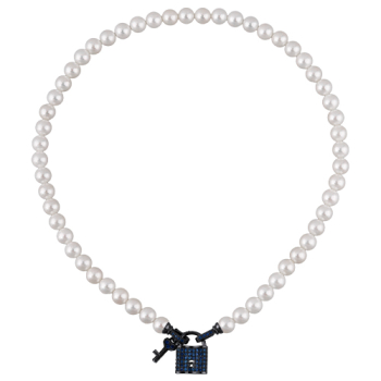 Изготовлено из ювелирного сплава на основе латуни с гальваническим покрытием черным родием. Изделие украшают жемчуг Майорка белого цвета диаметром 8мм и фианит синего цвета. Длина 45см.
