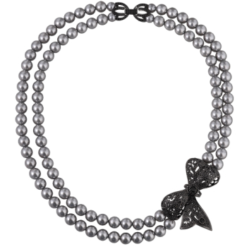 Изготовлено из ювелирного сплава на основе латуни с гальваническим покрытием черным родием. Изделие украшают темно-серый жемчуг Майорка диаметром 8мм и фианит черного цвета. Длина колье 45см.
