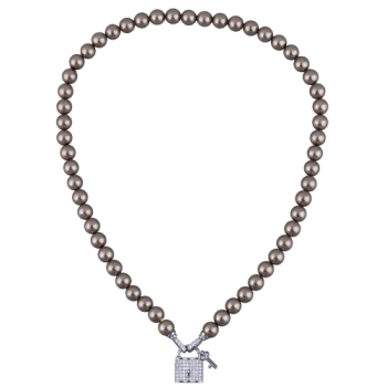 Изготовлено из ювелирного сплава на основе латуни с гальваническим покрытием родием. Изделие украшают темно-серый жемчуг Майорка диаметром 8мм и белый фианит Длина колье 45см.