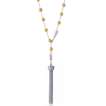 Изготовлено из ювелирного сплава на основе латуни с гальваническим покрытием родием. Изделие украшают жемчуг диаметром 9мм белого цвета, Майорка желтого цвета и белые фианит. Длина колье 73см. Кисточка 7см.