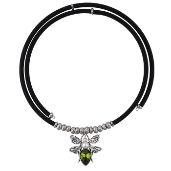 Изготовлено из ювелирного сплава на основе латуни с гальваническим покрытием античным серебром. Изделие украшают кристаллы SW зеленого цвета, белый майорский жемчуг диаметром 6мм и черный каучуковый шнурок. Размер кулона 3.5х3см.