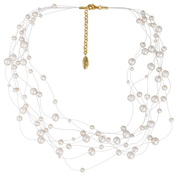 Изготовлено из ювелирного сплава на основе латуни с гальваническим покрытием золотом. Изделие украшает белый жемчуг диаметром 4-7мм. Длина колье 42см. Замок-карабин с удлинителем 5см. *Цвет и форма жемчужин может отличаться от изображенной на фото.