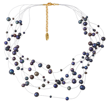 Изготовлено из ювелирного сплава на основе латуни с гальваническим покрытием золотом. Изделие украшает бензиновый жемчуг диаметром 4-7мм. Длина колье 42см. Замок-карабин с удлинителем 5см.