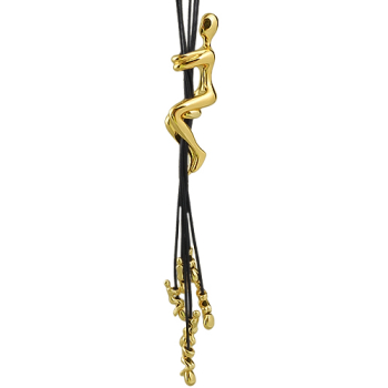 Изготовлено из ювелирного сплава на основе латуни с гальваническим покрытием золотом. Длина 90см. На черных шелковых нитях установлен регулятор длины. Замок-карабин с удлинителем 5см. Размер украшения 6х1.5см.