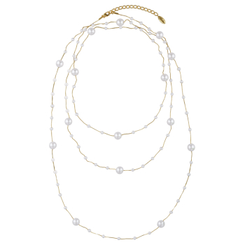 Изготовлено из ювелирного сплава на основе латуни с гальваническим покрытием золотом. Изделие украшает майорка диаметром 5-10мм белого цвета. Длина колье 190см.