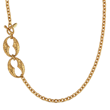 Изготовлено из ювелирного сплава на основе латуни с гальваническим покрытием золотом. Длина 99см. Замок-тогл. Размер кулона 7х3см.