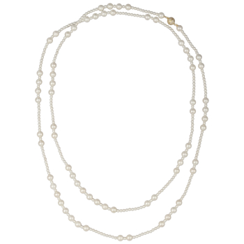 Изготовлено из ювелирного сплава на основе латуни с гальваническим покрытием золотом. Изделие украшает майорский круглый жемчуг белого цвета диаметром 6-10мм. Длина колье 155см.