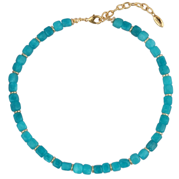 Изготовлено из ювелирного сплава на основе латуни с гальваническим покрытием золотом. Изделие украшает натуральный лазурно-бирюзовый кварц диаметром 7-8мм. Длина 42см. Замок-карабин с удлинителем 7см.