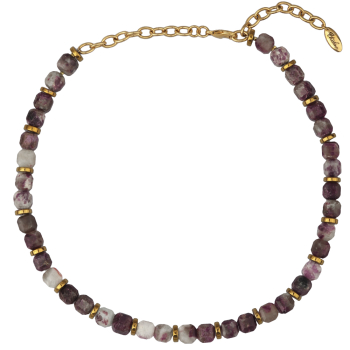 Изготовлено из ювелирного сплава на основе латуни с гальваническим покрытием золотом. Изделие украшает сливовый турмалин 8мм. Длина 45см. Замок-карабин с удлинителем 5см.