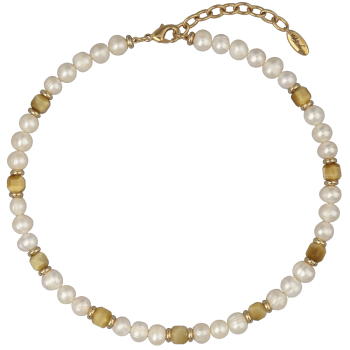 Изготовлено из ювелирного сплава на основе латуни с гальваническим покрытием золотом. Изделие украшает белый натуральный жемчуг 8мм и улексит. Длина 40см. Замок-карабин с удлинителем 5см.