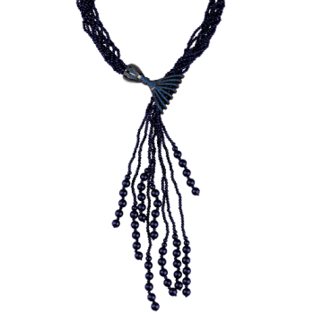 Изготовлено из ювелирного сплава на основе латуни с гальваническим покрытием черным родием. Изделие украшают шпинель диаметром 3мм синего цвета, агат синий 8мм и синие фианиты. Длина колье регулируется.
