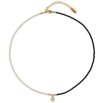 Изготовлено из ювелирного сплава на основе латуни с гальваническим покрытием золотом. Изделие украшают черный шпинель, жемчуг диаметром мм белого цвета и белые кристаллы. Длина 40см. Замок-карабин с удлинителем 5см.
