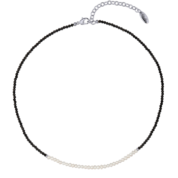 Изготовлено из ювелирного сплава на основе латуни с гальваническим покрытием родием. Изделие украшают черная шпинель и жемчуг диаметром 3-5мм белого цвета. Длина 40см. Замок-карабин с удлинителем 5см.