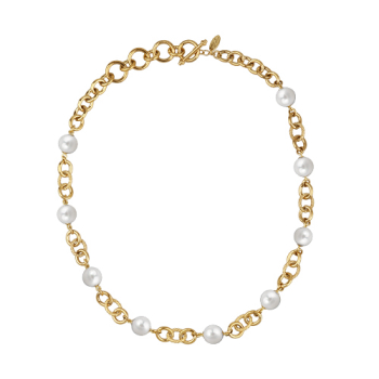 Изготовлено из ювелирного сплава на основе латуни с гальваническим покрытием золотом. Изделие украшает майорский круглый жемчуг белого цвета диаметром 12мм. Длина колье 50см. Застёжка в форме якоря с удлинителем 10см.