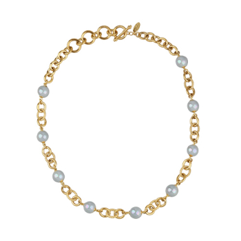 Изготовлено из ювелирного сплава на основе латуни с гальваническим покрытием золотом. Изделие украшает майорский круглый жемчуг голубого цвета диаметром 12мм. Длина колье 50см. Застёжка в форме якоря с удлинителем 10см.