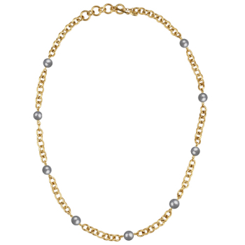 Изготовлено из ювелирного сплава на основе латуни с гальваническим покрытием золотом. Изделие украшает майорский круглый жемчуг серо-голубого цвета диаметром 12мм. Длина колье 77см. Застёжка в форме якоря с удлинителем 13см.