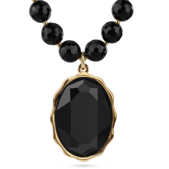 Изготовлено из ювелирного сплава на основе латуни с гальваническим покрытием золотом. Изделие украшают кристаллы SW черного цвета и черный агат диаметром 8мм. Длина колье 45см. Замок-карабин с удлинителем 5см. Размер кулона 30х20мм.