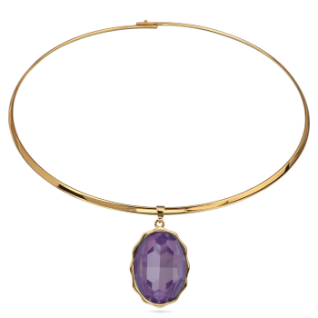 Изготовлено из ювелирного сплава на основе латуни с гальваническим покрытием золотом. Изделие украшают кристаллы SW пурпурного цвета. Длина колье 42см. Размер кулона 30х20мм.