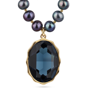 Изготовлено из ювелирного сплава на основе латуни с гальваническим покрытием золотом. Изделие украшают кристаллы SW темно-синего цвета и бензиновый жемчуг диаметром 8-9мм. Длина колье 43см. Замок-карабин с удлинителем 5см. Размер кулона 30х20мм.