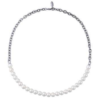 Изготовлено из ювелирного сплава на основе латуни с гальваническим покрытием родием. Изделие украшает жемчуг Майорка белого цвета диаметром 8мм. Длина 50см.
