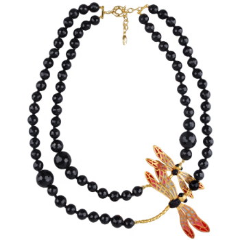 Изготовлено из ювелирного сплава на основе латуни с покрытием матовым золотом. Изделие расписано краской красного, розового и белого цвета, покрыто эмалью и украшено черным агатом фианитами. Длина колье 65см. Замок с удлинителем 4см.