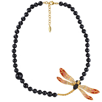 Изготовлено из ювелирного сплава на основе латуни с покрытием матовым золотом. Изделие расписано краской красного, розового и белого цвета, покрыто эмалью и украшено черным агатом и цирконами. Длина колье 72см.