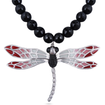 Колье Стрекоза (эмаль серая, красная, агат; покрытие матовый родий) 45-50см, Есть комплект