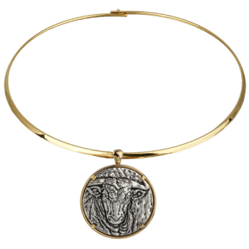 Изготовлено из ювелирного сплава на основе латуни с гальваническим покрытием золотом и античным золотом. Диаметр кулона 4см, длина 42см