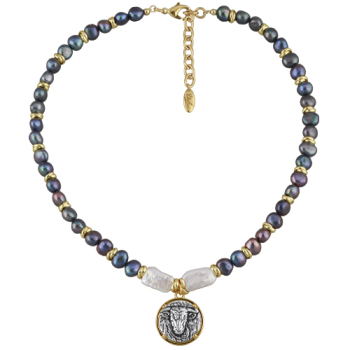 Изготовлено из ювелирного сплава на основе латуни с гальваническим покрытием античным золотом и античным серебром. Изделие украшает бензиновый жемчуг диаметром 6мм. Длина колье 44см. Замок-карабин с удлинителем 5см. Диаметр кулона 23мм.