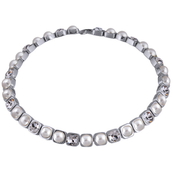 Изготовлено из ювелирного сплава на основе латуни с гальваническим покрытием родием. Изделие украшают кристаллы SW и жемчуг Майорка белого цвета диаметром 8мм. Длина 37-40см.