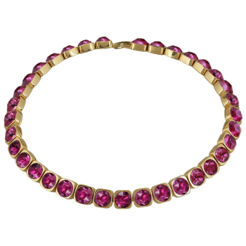 Изготовлено из ювелирного сплава на основе латуни с гальваническим покрытием золотом. Изделие украшают кристаллы SW цвета фуксия диаметром 7мм. Длина 37-40см.