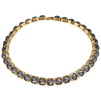 Изготовлено из ювелирного сплава на основе латуни с гальваническим покрытием золотом. Изделие украшают кристаллы SW темно-серого цвета диаметром 8мм. Длина 37-40см.