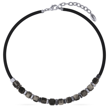 Изготовлено из ювелирного сплава на основе латуни с гальваническим покрытием родием. Изделие украшают натуральный агат и черный каучуковый шнурок. Длина 40см. Замок-карабин с удлинителем 5см.