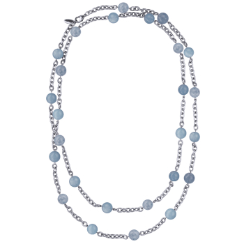 Изготовлено из ювелирного сплава на основе латуни с гальваническим покрытием родием. Изделие украшает аквамарин диаметром 12мм. Длина 140см.
