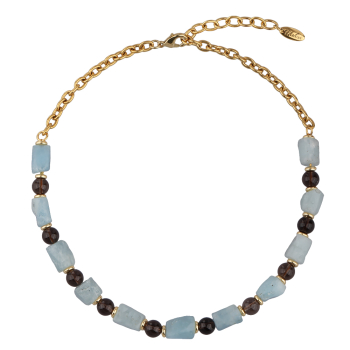 Изготовлено из ювелирного сплава на основе латуни с гальваническим покрытием золотом. Изделие украшают аквамарин и раухтопаз диаметром 8мм. Длина 45см. Замок-карабин с удлинителем 5см.