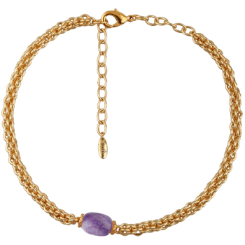 Изготовлено из ювелирного сплава на основе латуни с гальваническим покрытием золотом. Изделие украшает фиолетовый аметист диаметром 15мм. Длина колье 44см. Замок-карабин с удлинителем 5см.