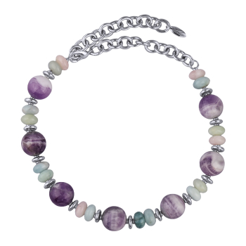 Изготовлено из ювелирного сплава на основе латуни с гальваническим покрытием родием. Изделие украшают разноцветный кварц и аметист диаметром 12-18мм. Длина колье 43см. Замок-карабин с удлинителем 8см.