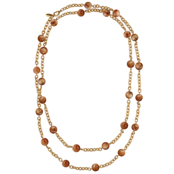 Изготовлено из ювелирного сплава на основе латуни с гальваническим покрытием античным золотом. Изделие украшает цитрин диаметром 12мм. Длина 140см.