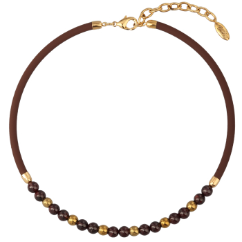 Изготовлено из ювелирного сплава на основе латуни с гальваническим покрытием золотом. Изделие украшает гранат диаметром 6мм. Длина каучукового шнурка цвета шоколад 45см. Замок-карабин с удлинителем 5см.