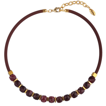 Изготовлено из ювелирного сплава на основе латуни с гальваническим покрытием золотом. Изделие украшают кубический граненый гранат диаметром 10мм, гематит и каучуковый шнурок шоколадного цвета. Длина 43см. Замок-карабин с удлинителем 5см.