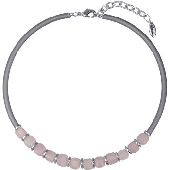 Изготовлено из ювелирного сплава на основе латуни с гальваническим покрытием родием. Изделие украшают натуральный кварц розового цвета и серый каучуковый шнурок. Длина 40см. Замок-карабин с удлинителем 5см.