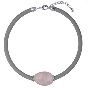 Изготовлено из ювелирного сплава на основе латуни с гальваническим покрытием родием. Изделие украшают розовый кварц и серый каучуковый шнурок. Длина каучукового шнурка 45см. Замок-карабин с удлинителем 5см.