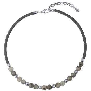 Изготовлено из ювелирного сплава на основе латуни с гальваническим покрытием родием. Изделие украшает лунный опал. Длина графитового каучукового шнурка 45см. Замок-карабин с удлинителем 5см.