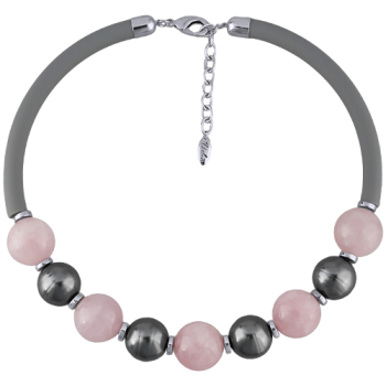 Изготовлено из ювелирного сплава на основе латуни с гальваническим покрытием родием. Изделие украшают жемчуг Майорка темно-серого цвета диаметром 18мм и розовый кварц диаметром 20мм. Длина серого каучукового шнурка 45см. Замок-карабин с удлинителем 5см.