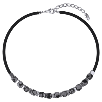 Изготовлено из ювелирного сплава на основе латуни с гальваническим покрытием родием. Изделие украшают обсидиан и черный каучуковый шнурок. Длина 40см. Замок-карабин с удлинителем 5см.