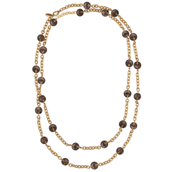 Изготовлено из ювелирного сплава на основе латуни с гальваническим покрытием золотом. Изделие украшает раухтопаз диаметром 12мм. Длина 135см.