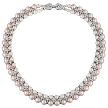 Изготовлено из ювелирного сплава на основе латуни с гальваническим покрытием родием. Изделие украшают жемчуг Майорка диаметром 7мм белого и светло-сиреневого цвета и белые фианит. Длина колье 45см.